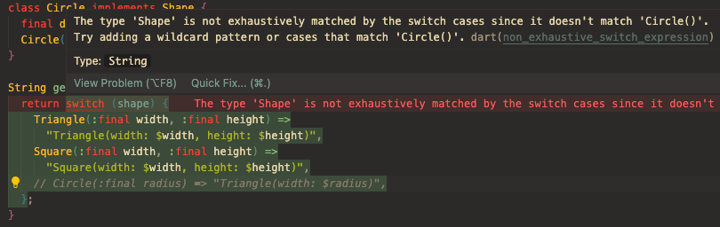 The type ‘Shape’ is not exhaustively mathced by the switch cases since it doesn’t match ‘Circle()’.