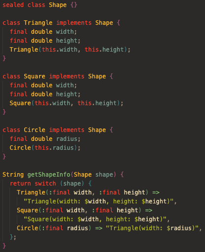 Dartでは “is” 演算子を使用するとオブジェクトの型チェックが可能で、Shape型のサブクラスであるTriangle, Square, Circle型にそれぞれマッチした処理を記述することが可能です。
