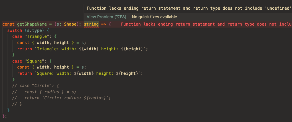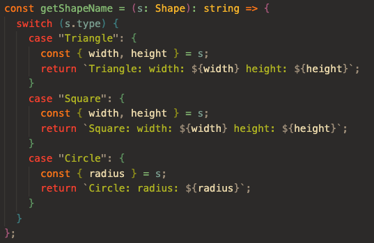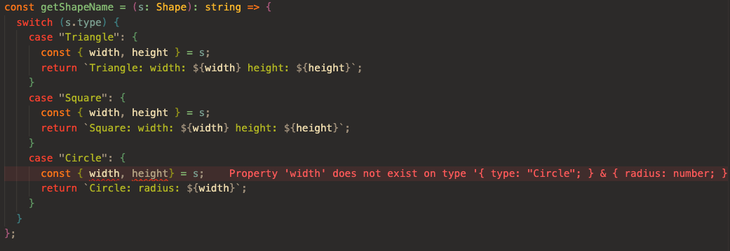 下記の例では、”Circle”にマッチしている場合は s = {type: “Circle”; radius: number} でることをTSCが推論してくれるため、width, heightなどのプロパティを参照しようとするとコンパイルエラーになります。