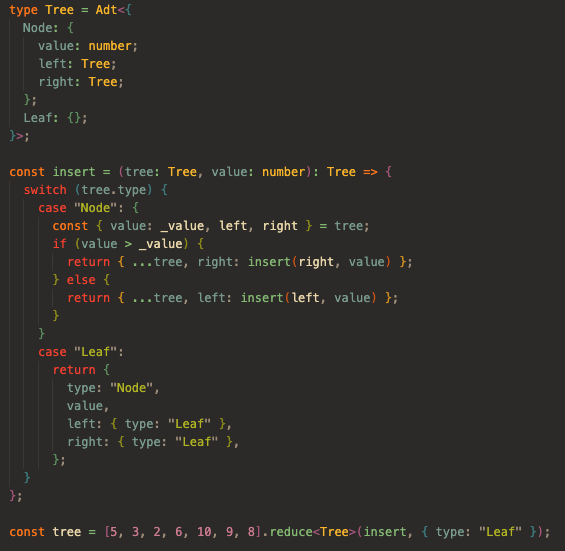 insert関数はTree構造を再帰的に探索して新しいNodeを挿入するための関数ですが、木構造の末端(Leaf)に到達した場合(case “Leaf”のブロック)ではすでにLeaf型に推論されているので、誤ってvalue, left, rightプロパティを参照することがありません。